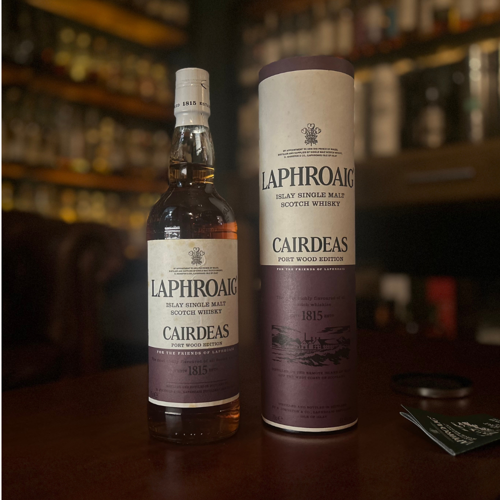 Limited edition Laphroaig Cairdeas Port Wood Finish from Feis Ile 2013. Aged 8 years in bourbon casks, then 14 months in port pipes, this 51.3% ABV Islay malt balances sweet and smoky notes. Expect caramel, burnt strawberries, and marshmallows on the nose, with a peat-forward palate of salt, red berries, and burnt oak. Smooth and complex, ideal for collectors. (Bottle size 700ml)